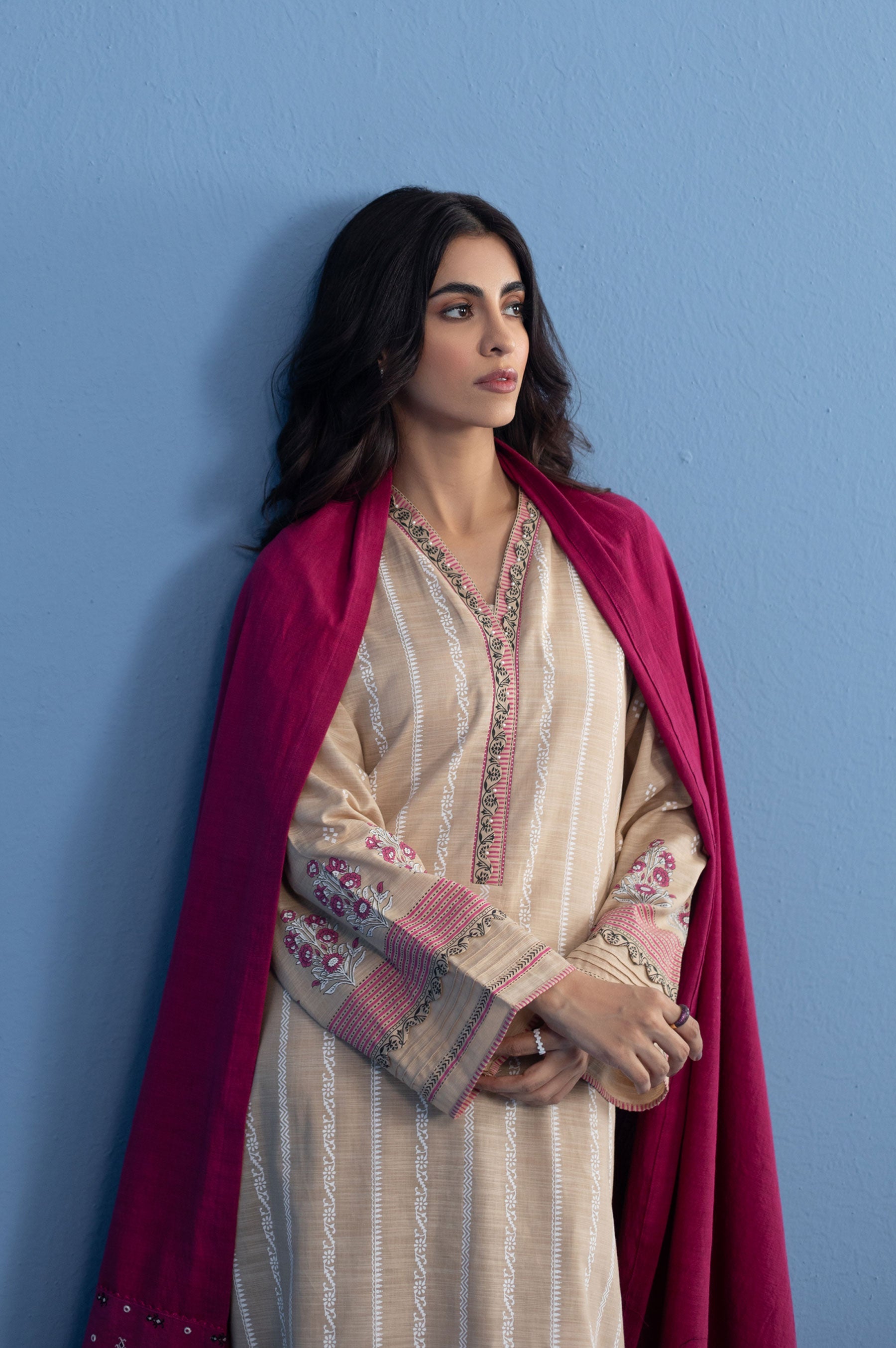 The beige shirt, adorned with delicate block print look, offers a timeless charm, while the pink embroidered dupatta adds a pop of color and intricate detailing, resulting in a gracefully balanced ensemble that seamlessly combines simplicity with a touch of sophistication.