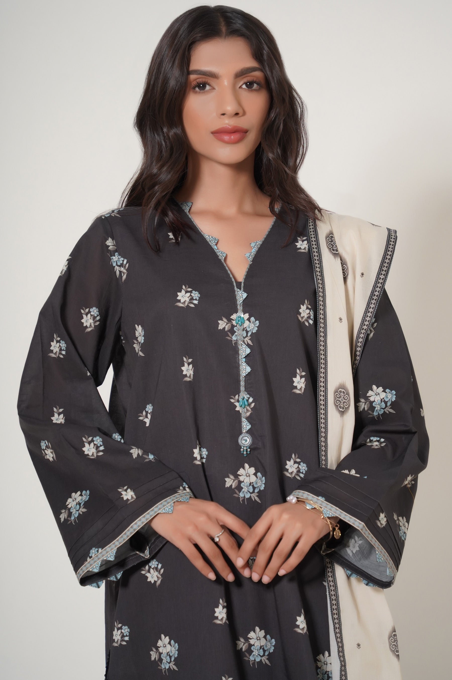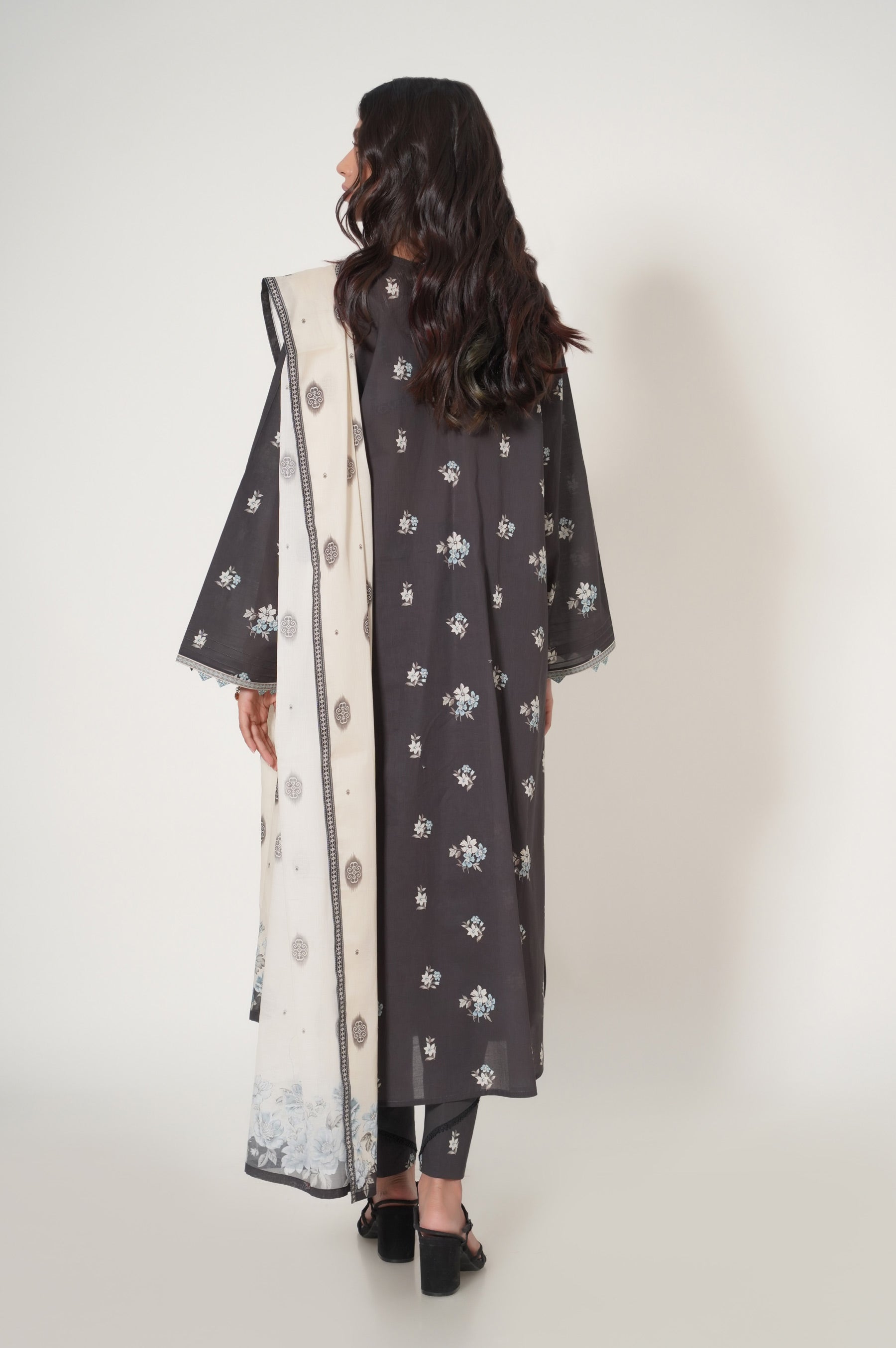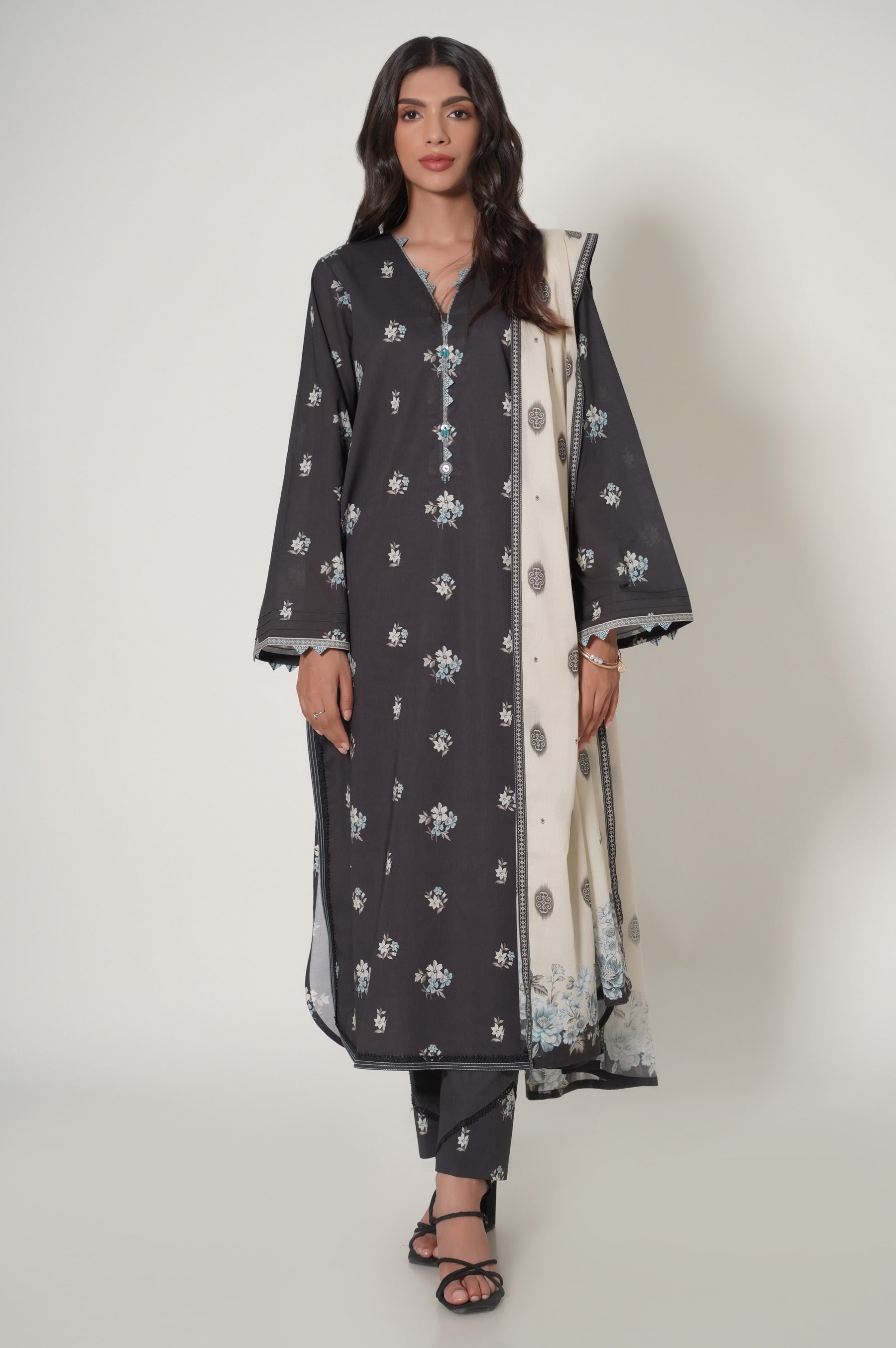 This 3 piece design potrays a floral bloom with subtle palette draped with chic floral illustrated dupatta etched around the edges being the epitome of grace.