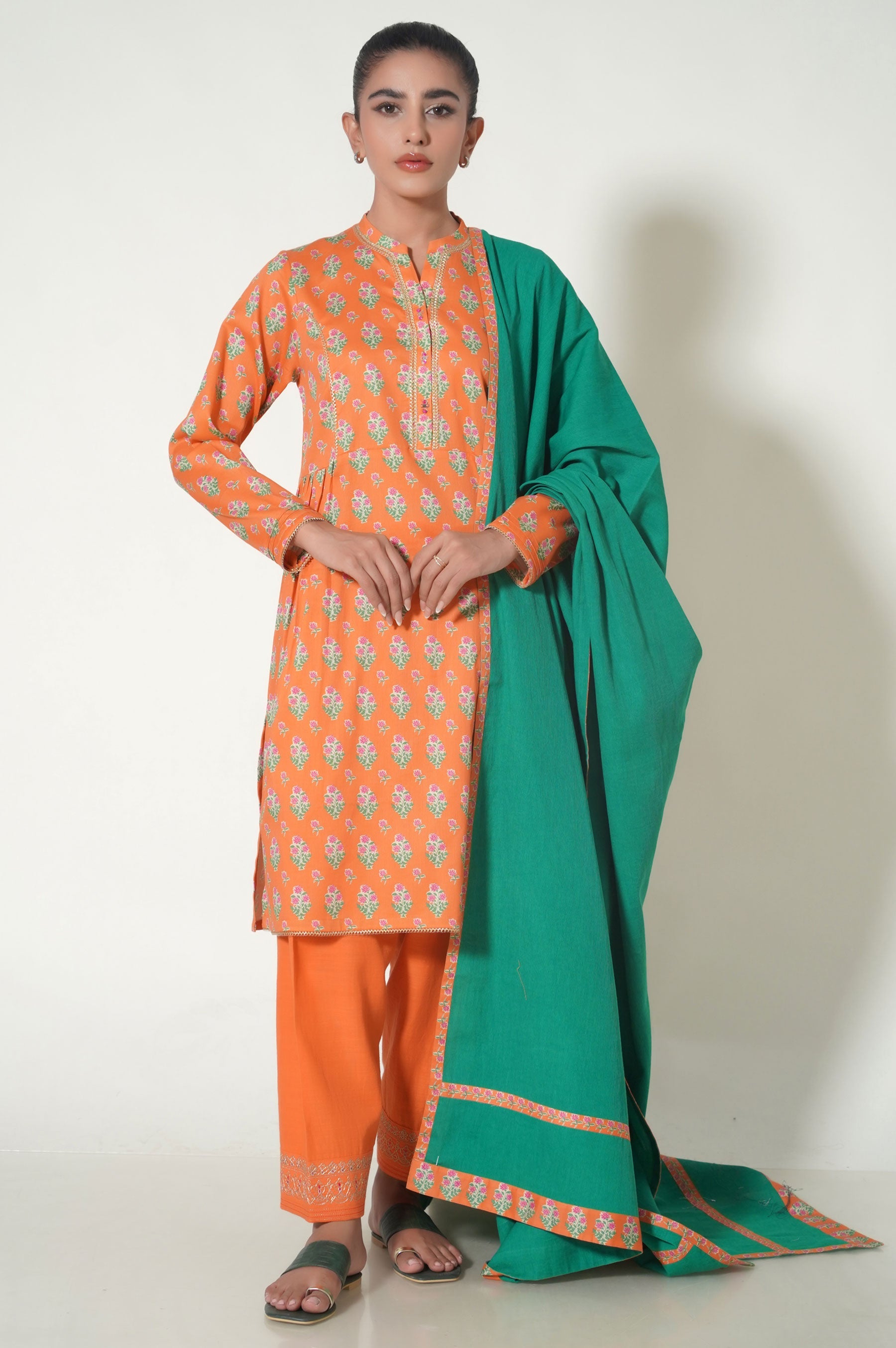A bright color kurta set features an eye-catching bold block print booti motifs that add a touch of elegance and sophistication in kurta. Paired with dyed dupatta and gold zari embroidered bottom.