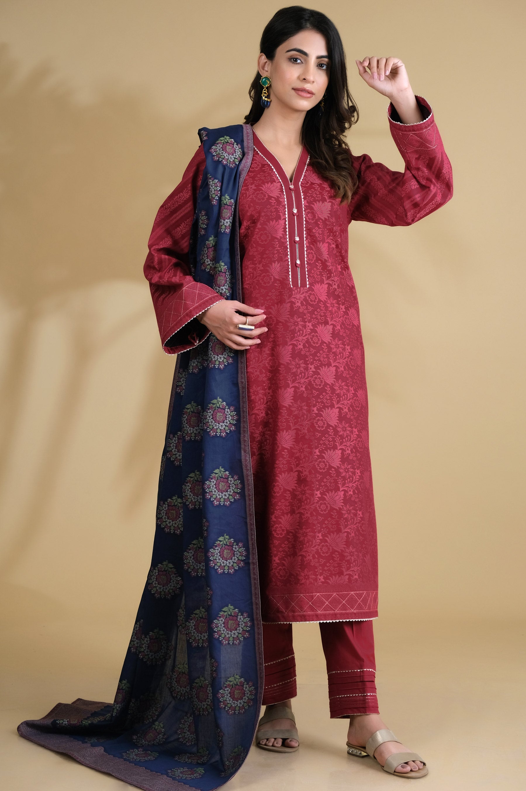 Radiate confidence in this charming color palette. Featuring a coloured floral jacquard dupatta with a floral self jacquard shirt.