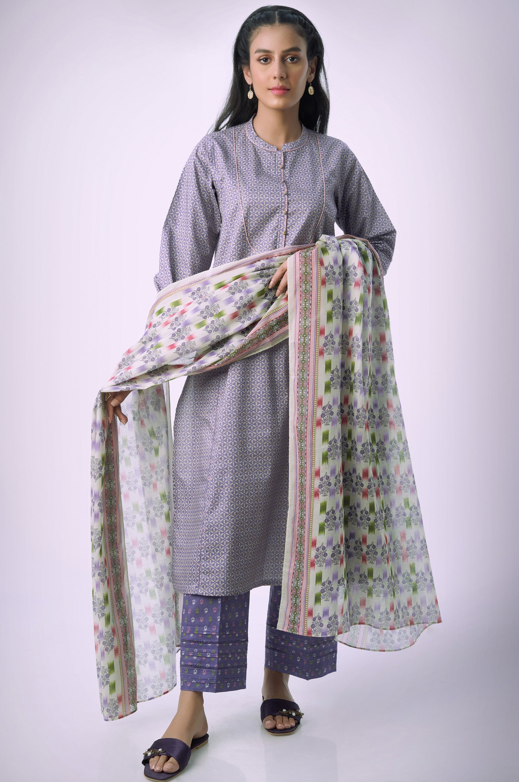 A mauve kurta and beige dupatta is adorned with vibrant ikat waves for a stunning appearance.