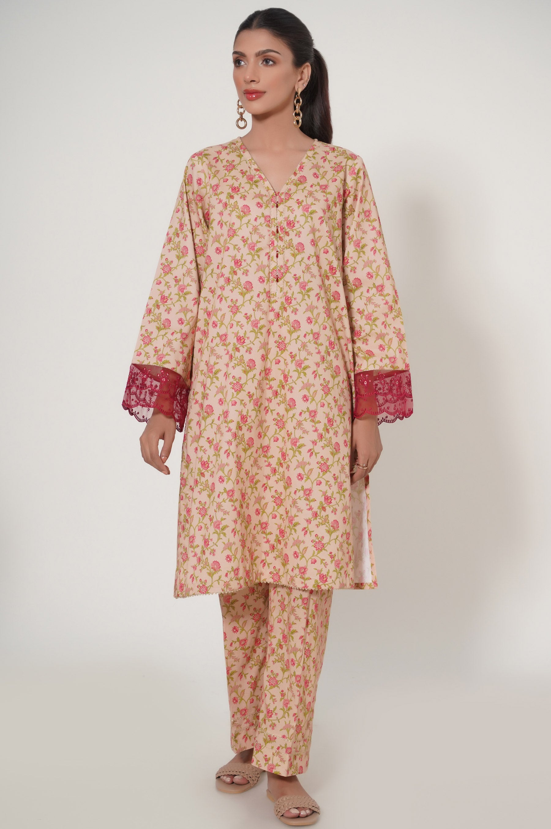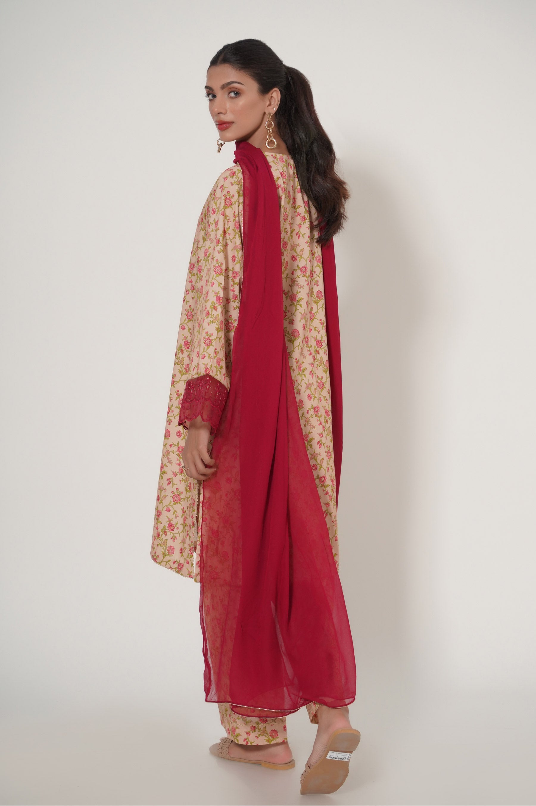 Printed floral kurta cord set with chiffon dyed dupatta is perfect. It has self contrasting embroidery on the sleeves.