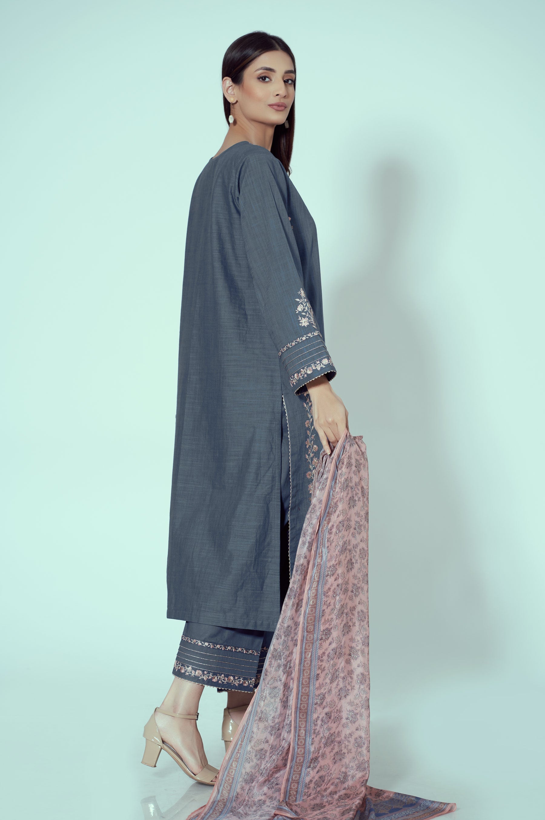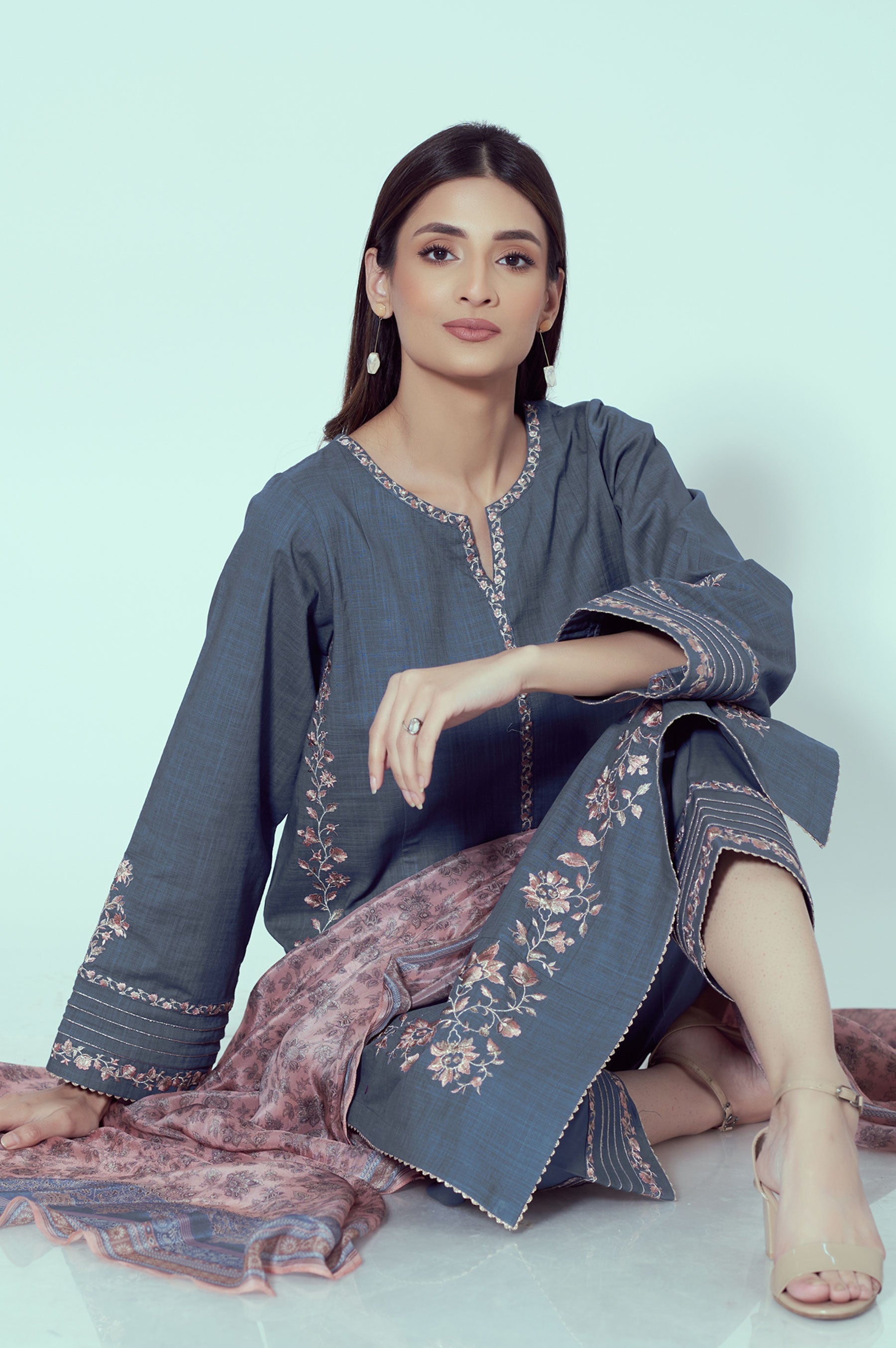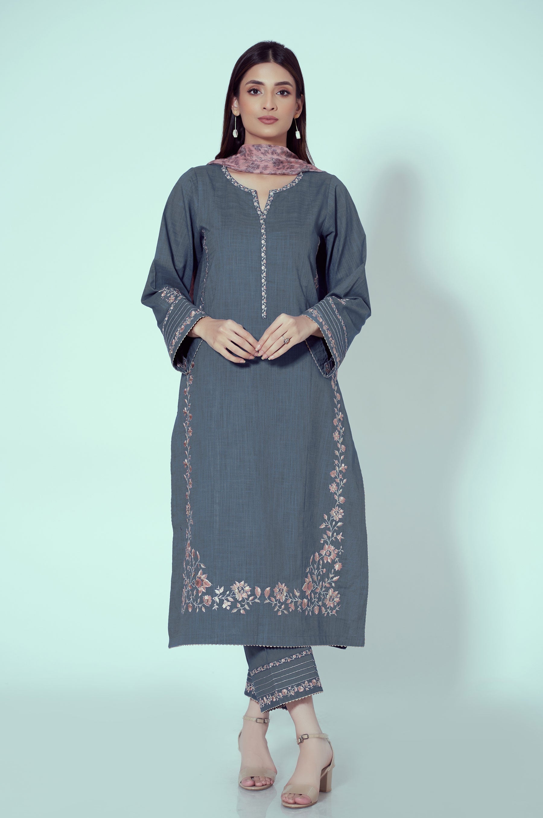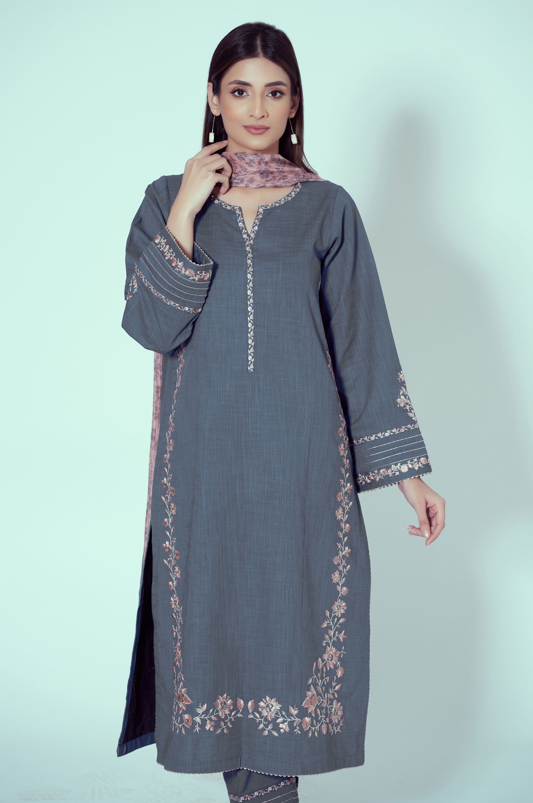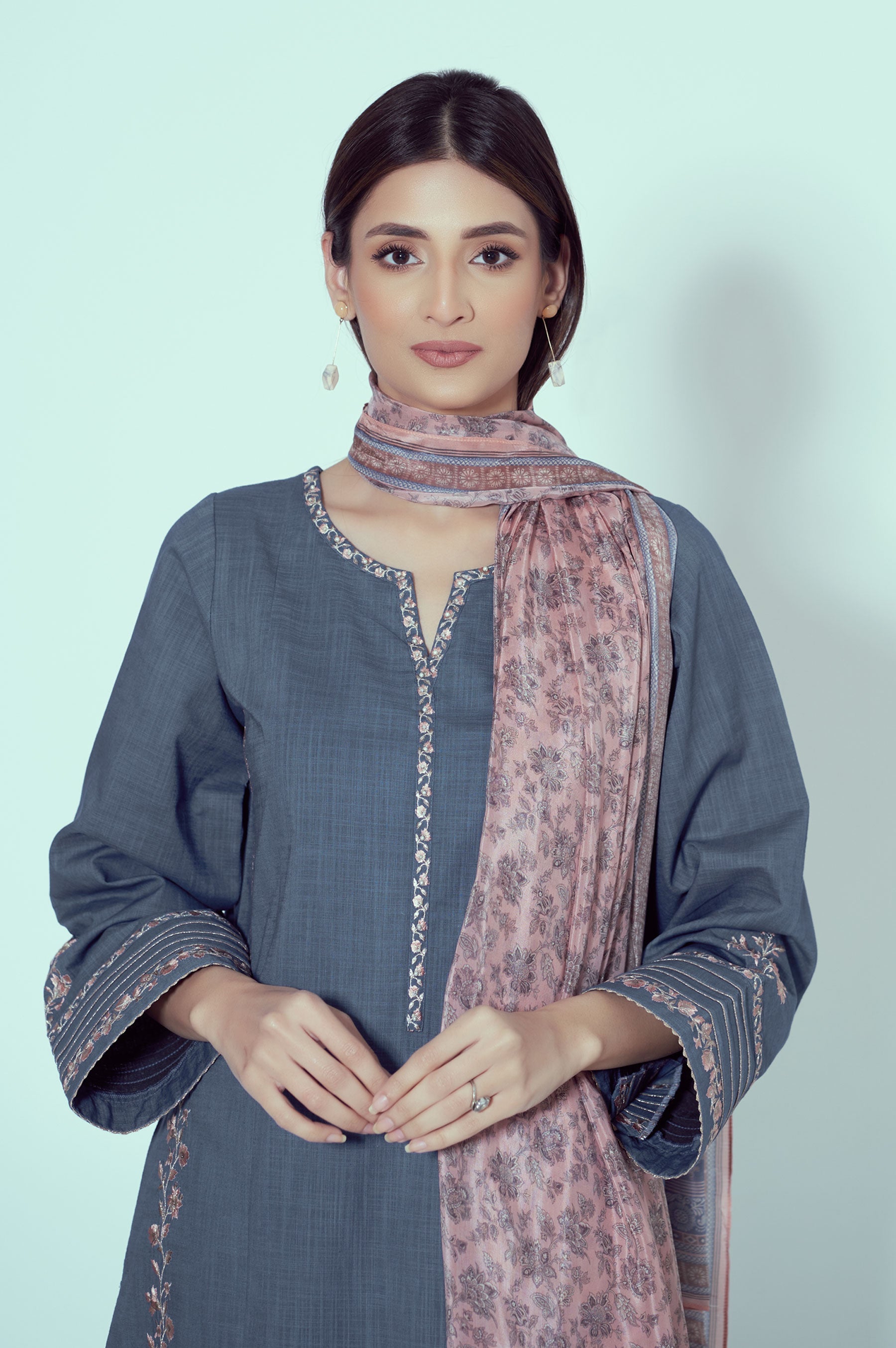 Unstitched 3 Piece Embroidered Textured Slub Suit
