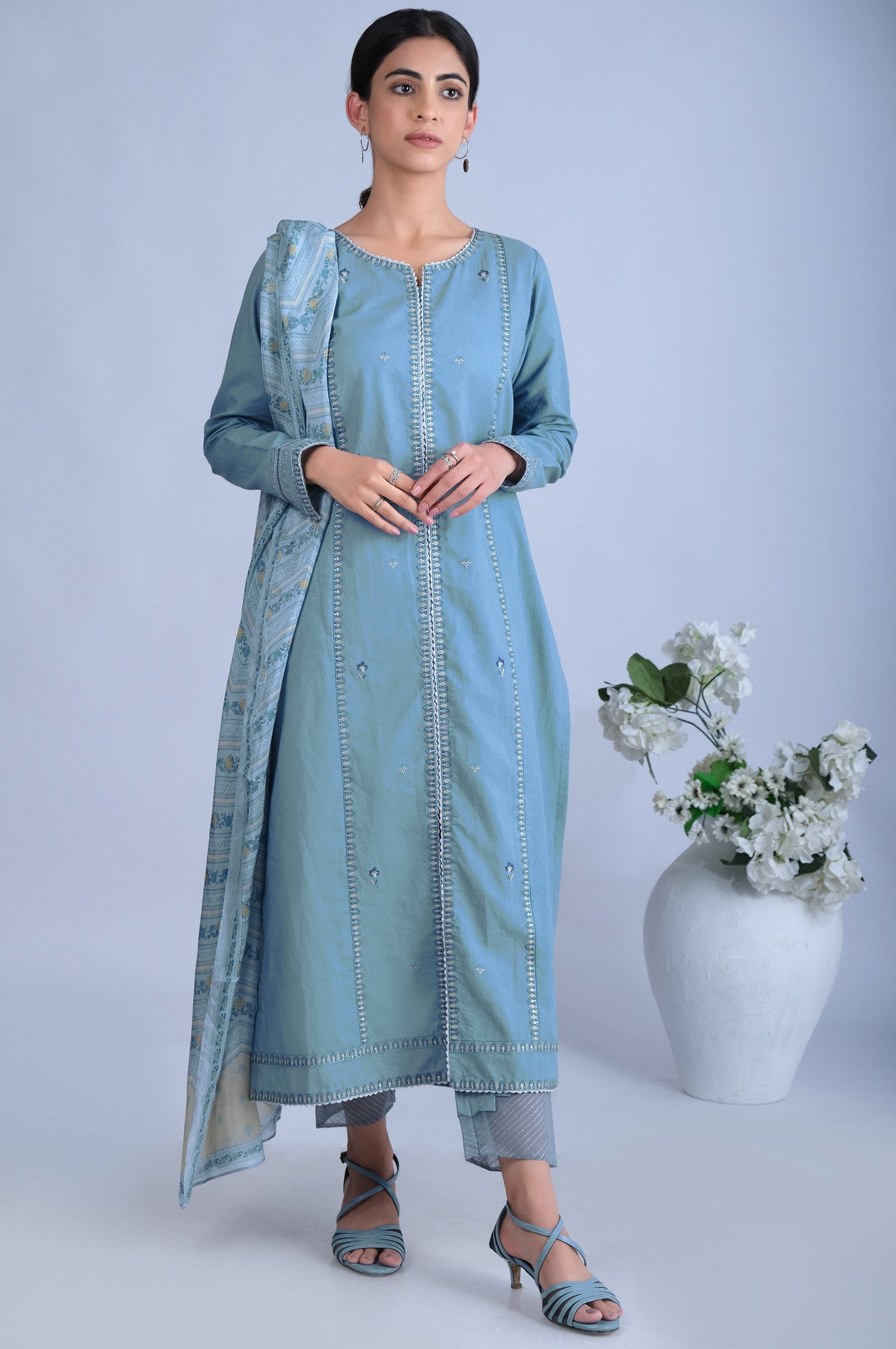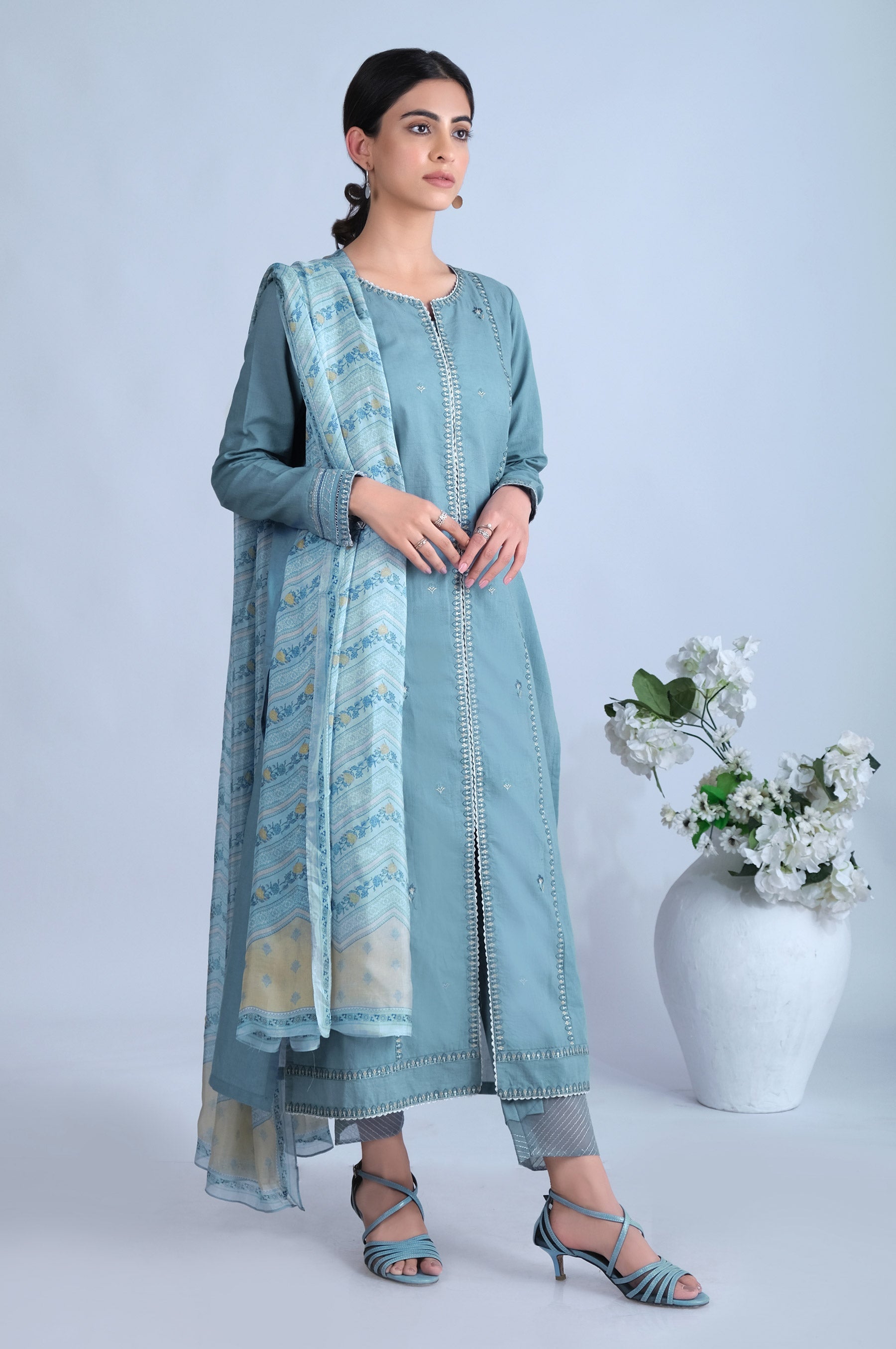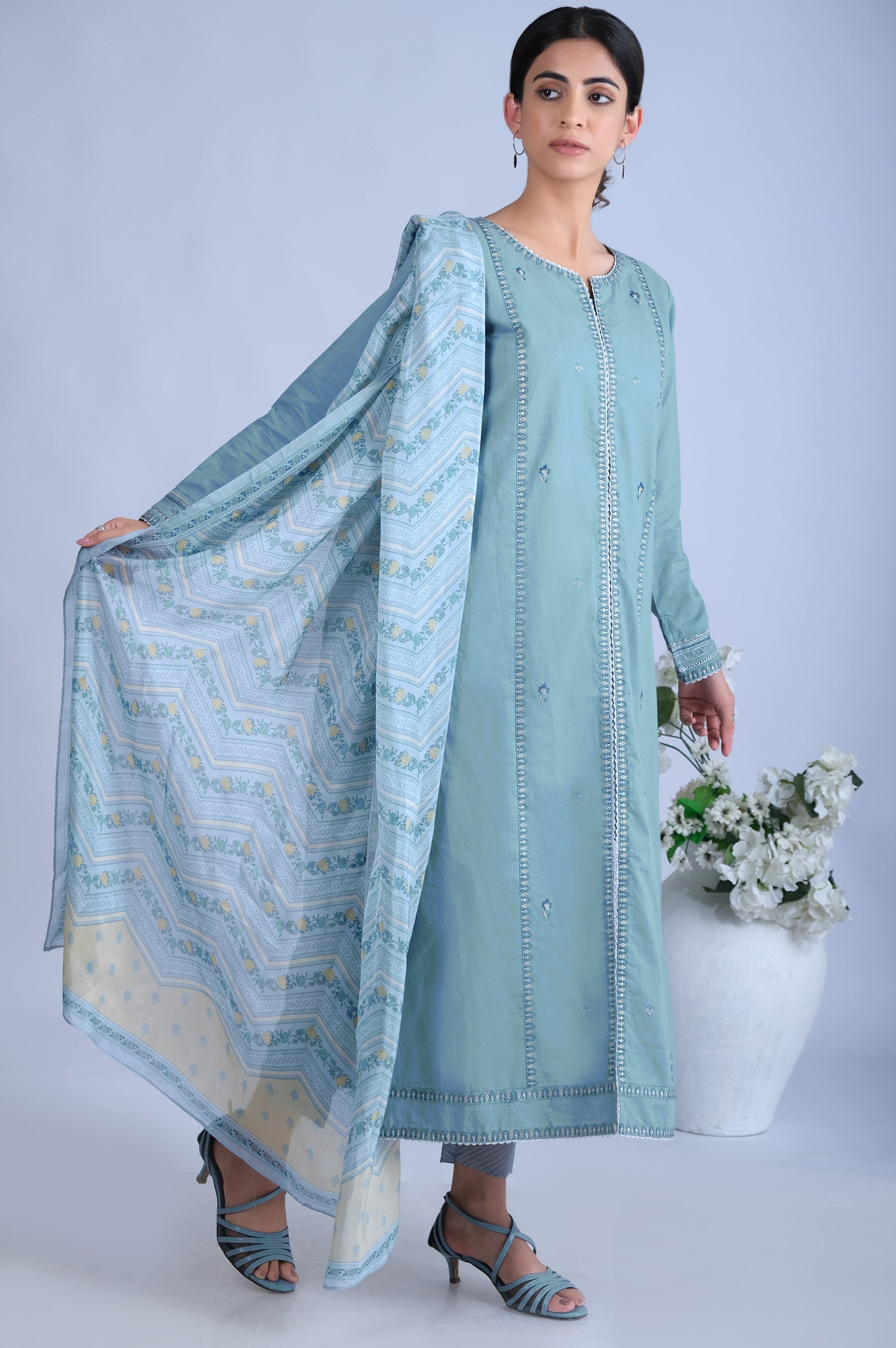 The mesmerizing ensembles of printed silk dupatta with daintly embroidered slub lawn shirt, depicting the essence of the traditional art of festive wardrobe..