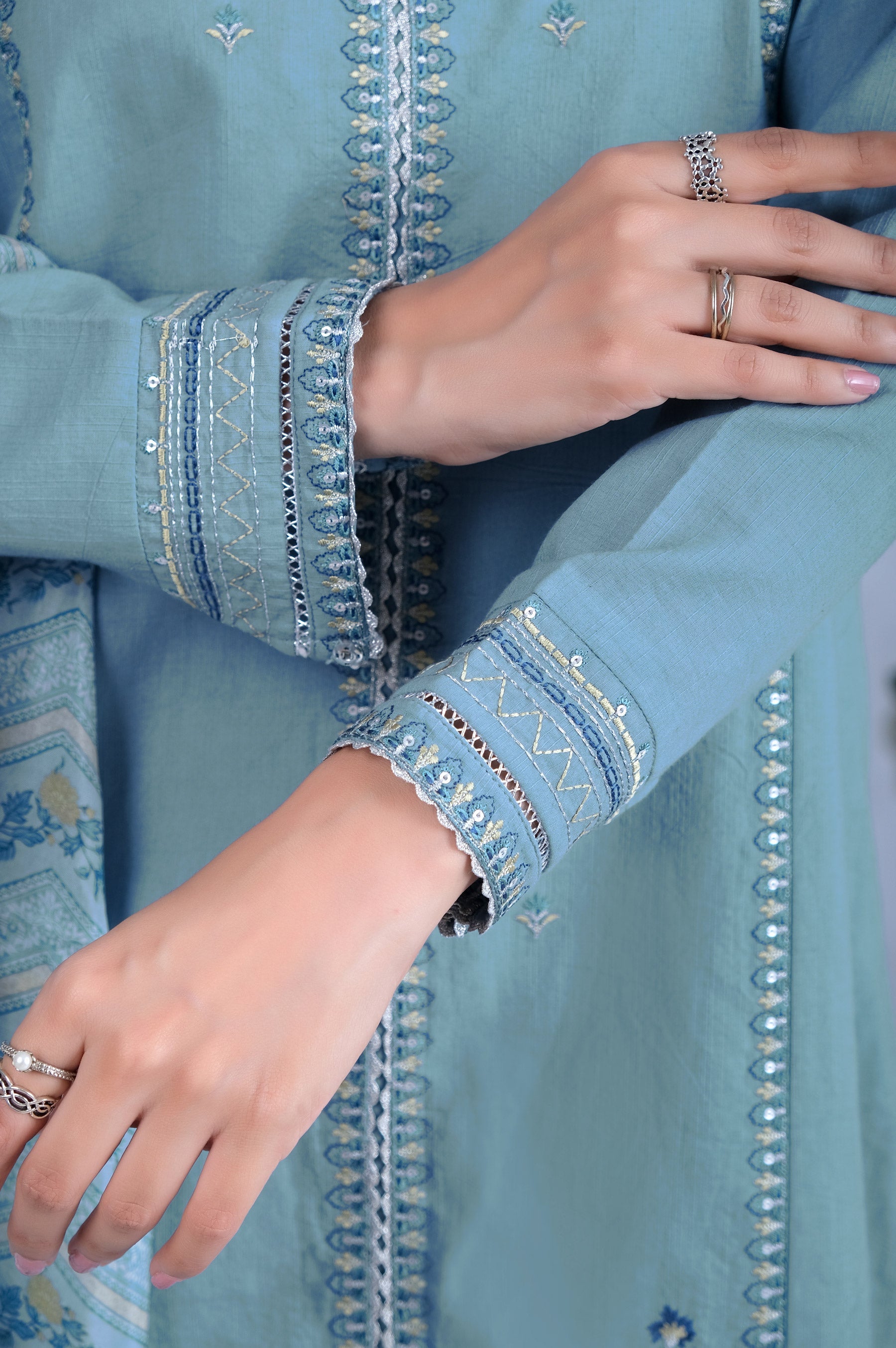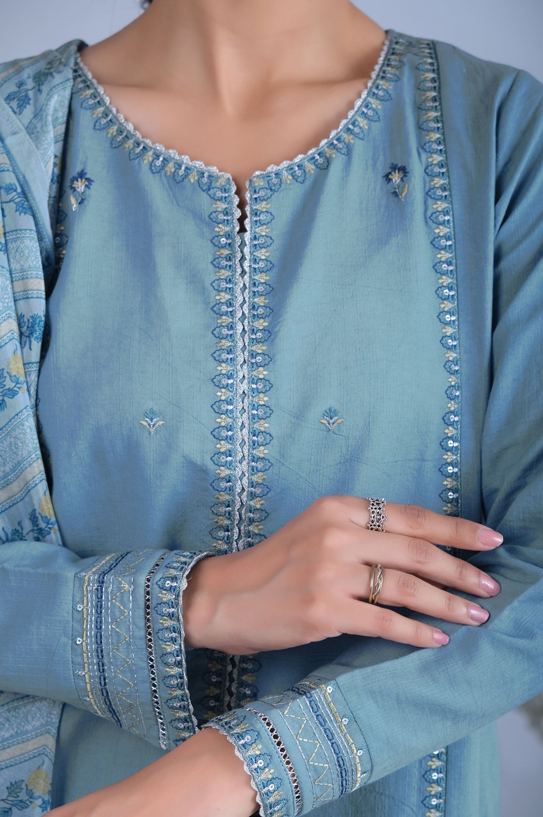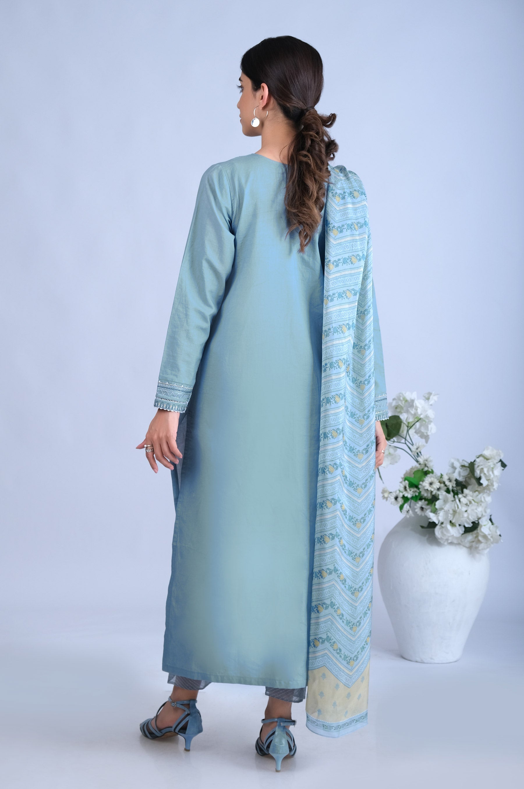The mesmerizing ensembles of printed silk dupatta with daintly embroidered slub lawn shirt, depicting the essence of the traditional art of festive wardrobe..