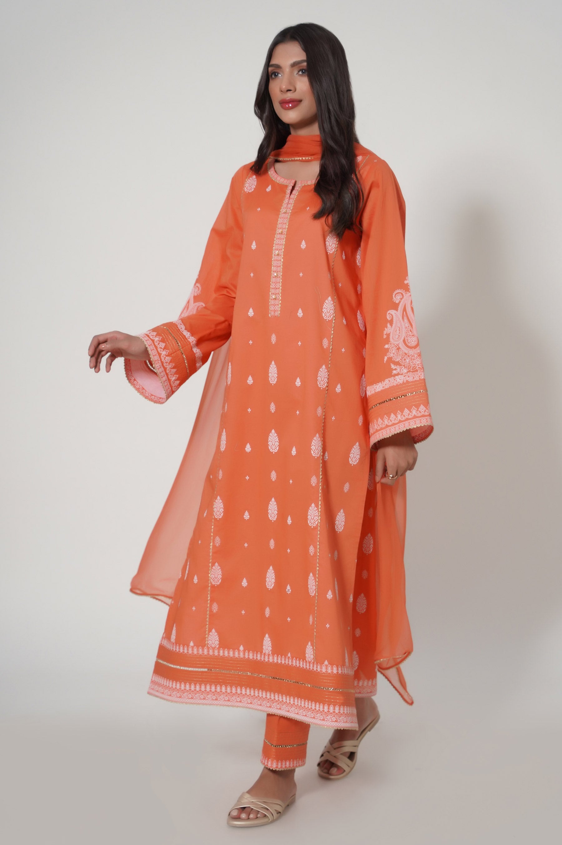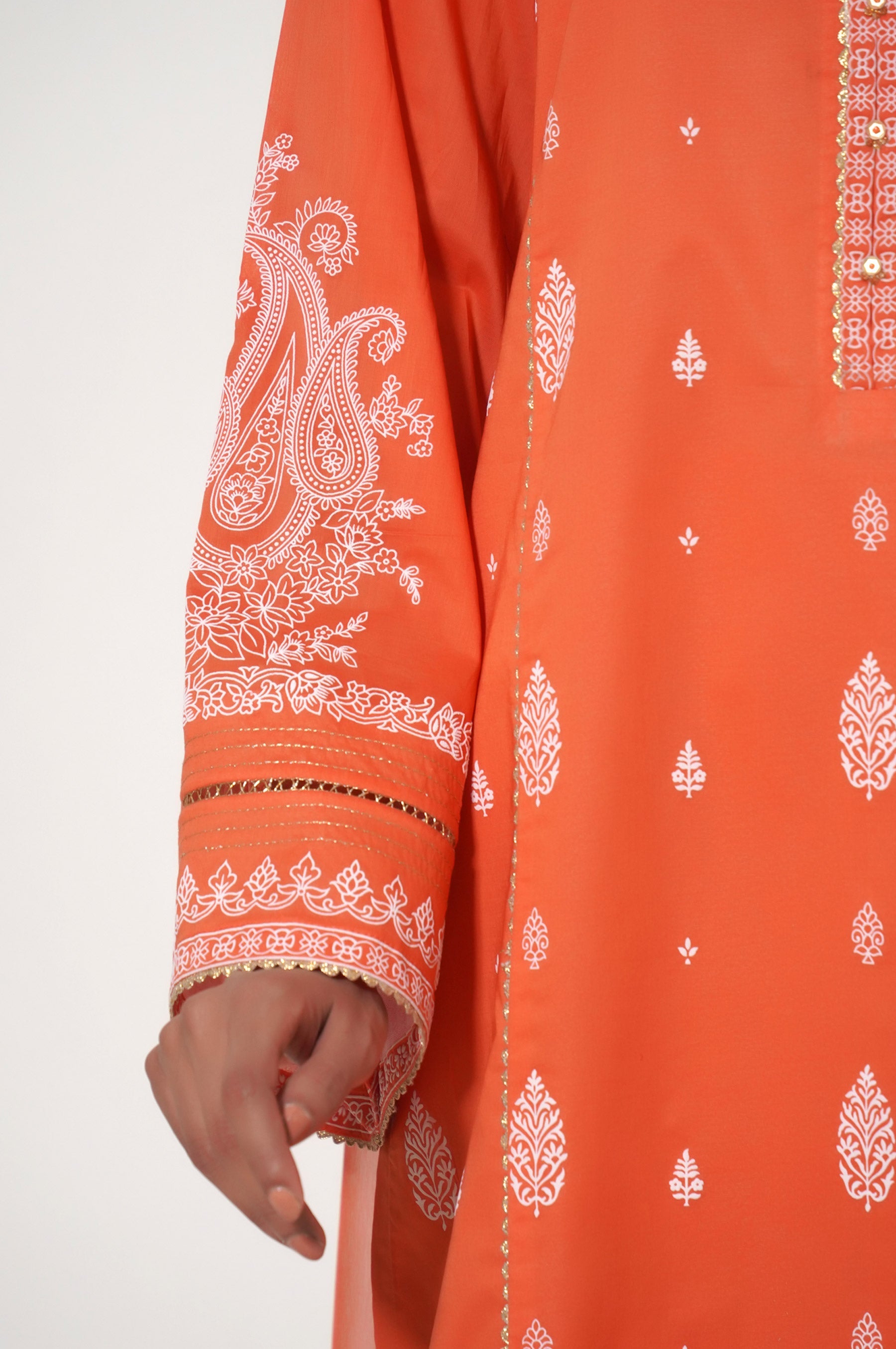 Make a bold statement with this impeccably crafted bright orange suit, featuring a stunning puff print design and intricate lace and zari detailing for a touch of refined elegance