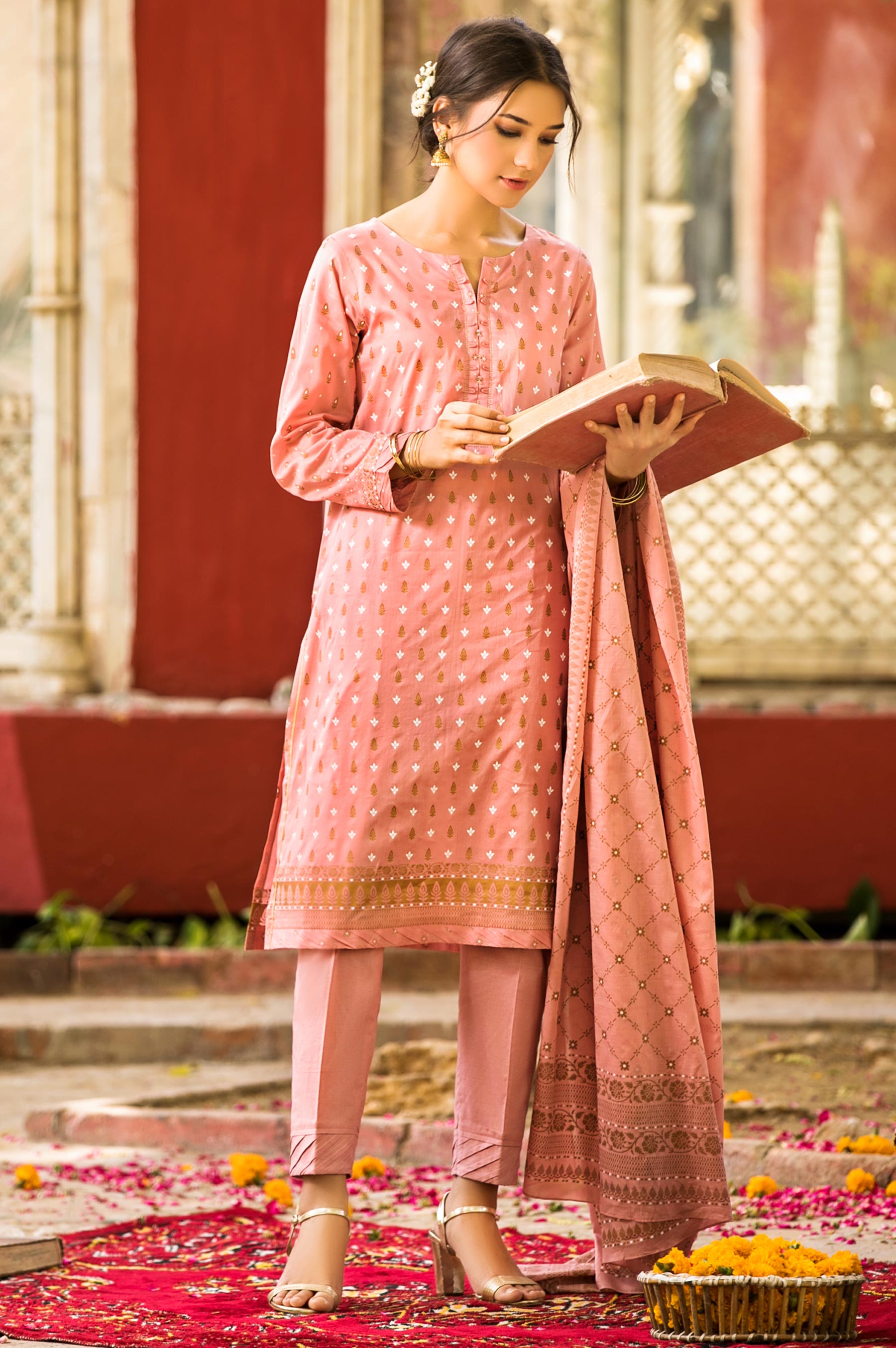 2.5 Meters Printed White & Gold Paste Lawn Shirt, 2 Meters Dyed Cambric Bottom, 2.5 Meters Printed White & Gold Paste Lawn Dupatta