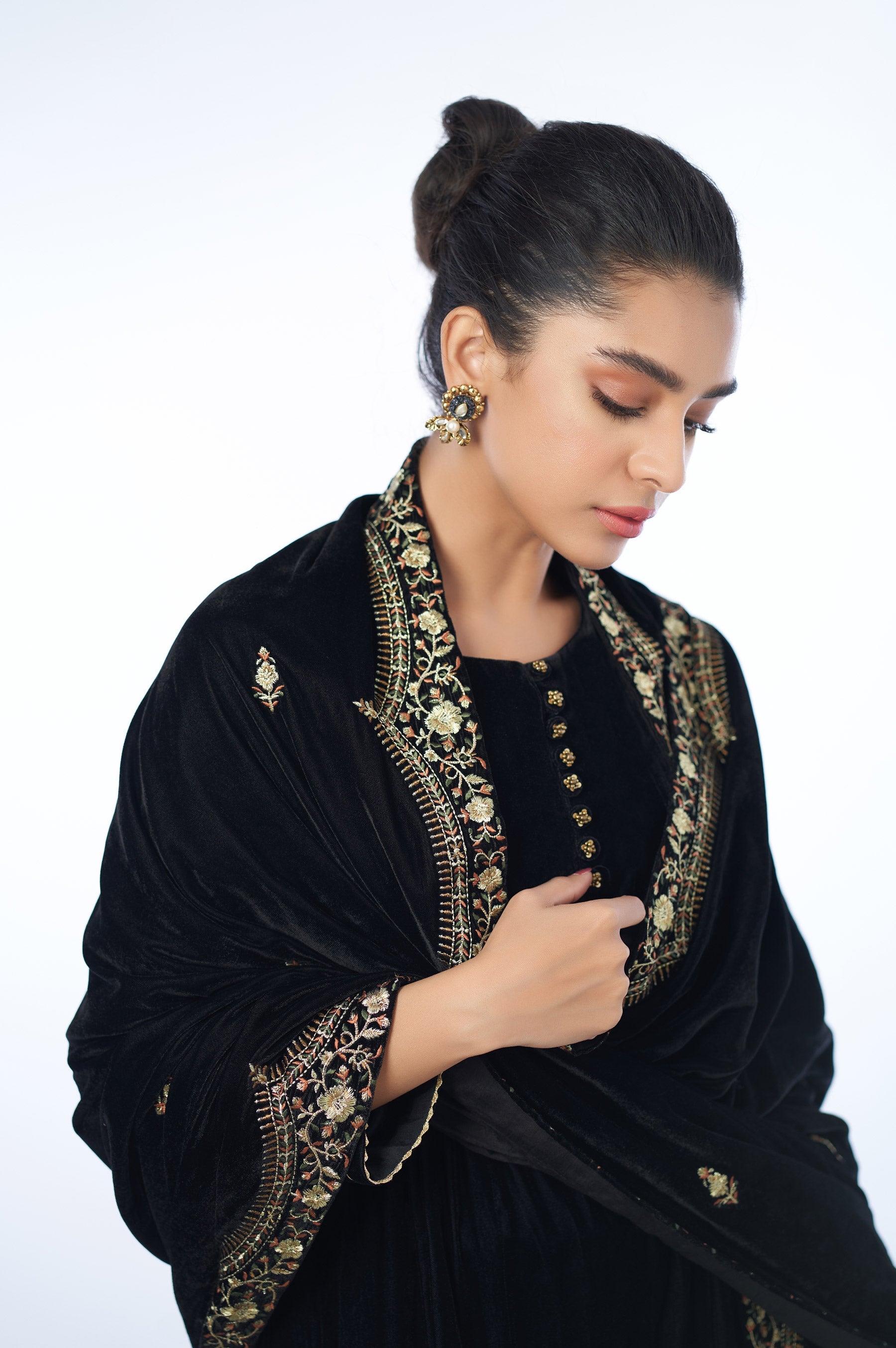 A stunning intricately embroidered shawl in black velvet, with floral imagery on the borders. .