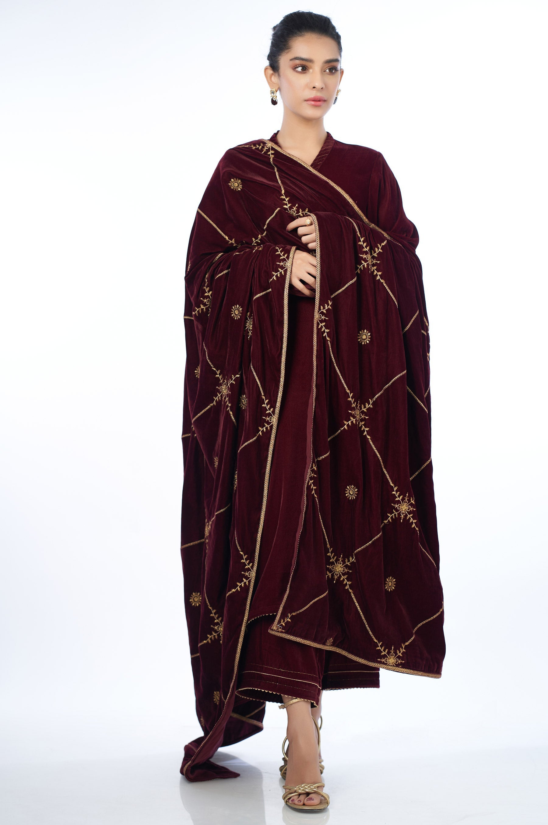 Step out with confidence in this winter season, wrapped up with our maroon velvet embroidered shawl. The intimate detailing of the design is timeless, precious and alluring.