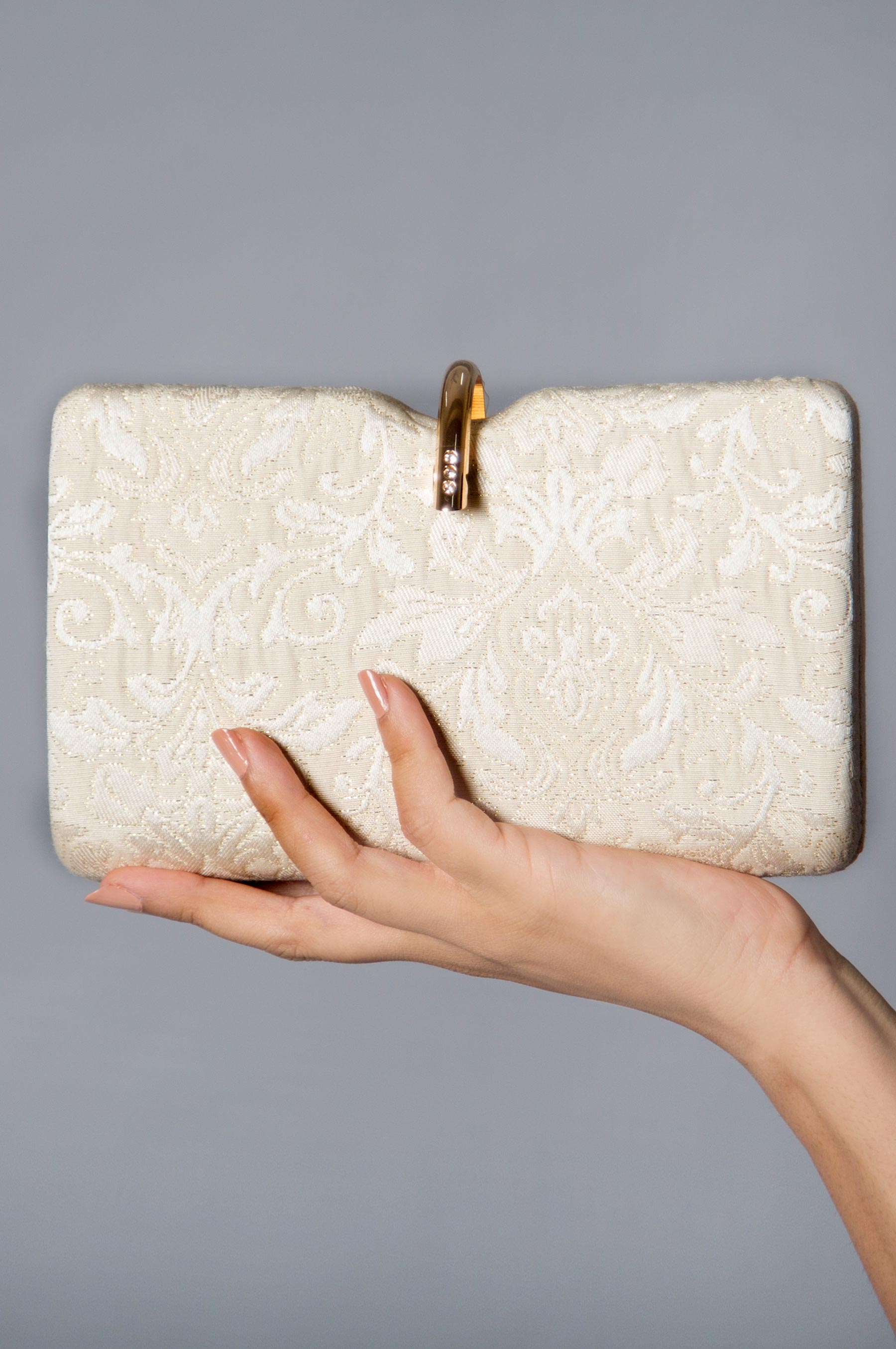 A fancy shimmer edgy clutch with a captivating golden leaf lock- Perfect for party ocassion to glam up your look.