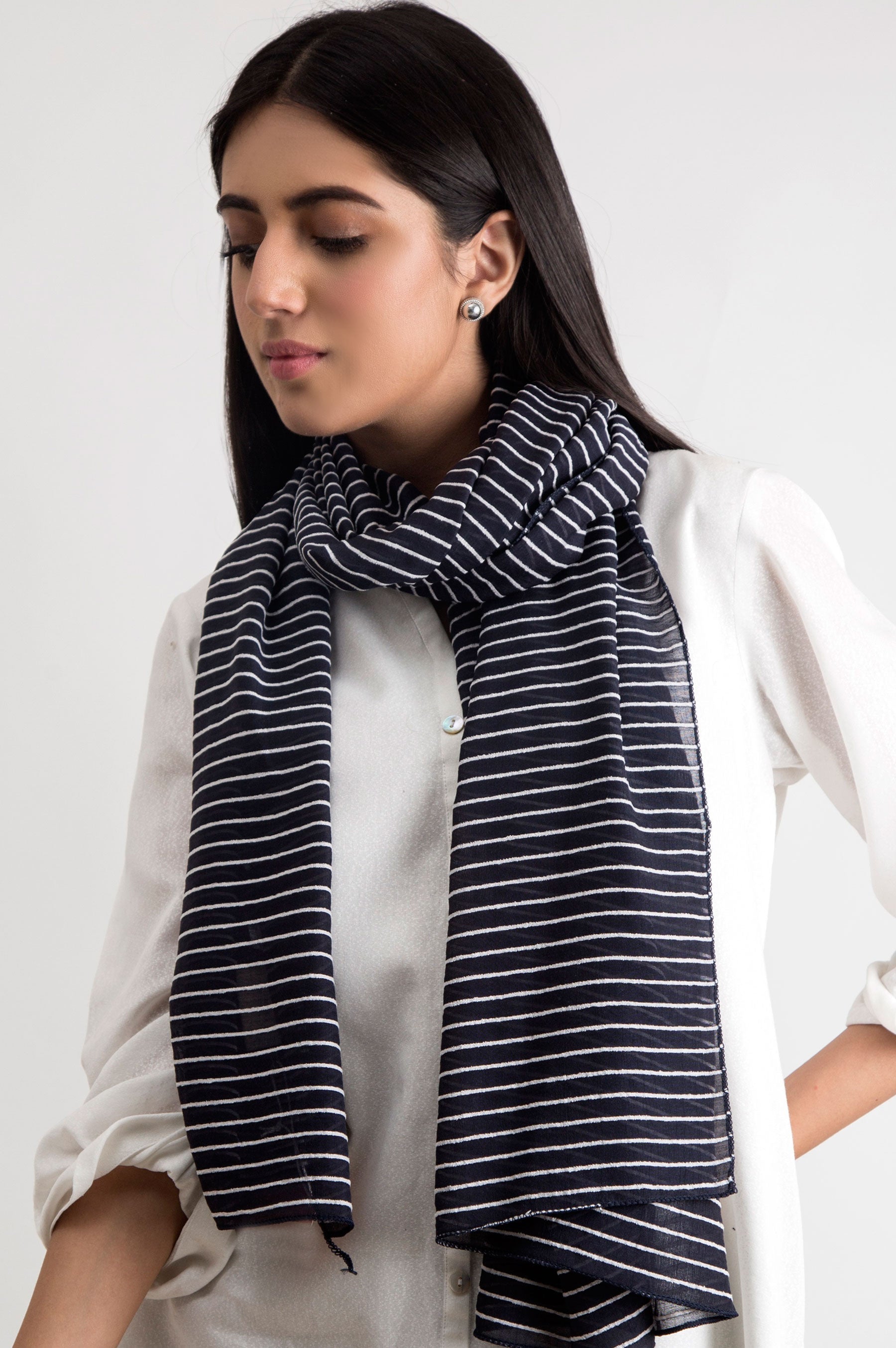 A cozy scarf with woven stripes on viscose is ready to give you a chic summer style